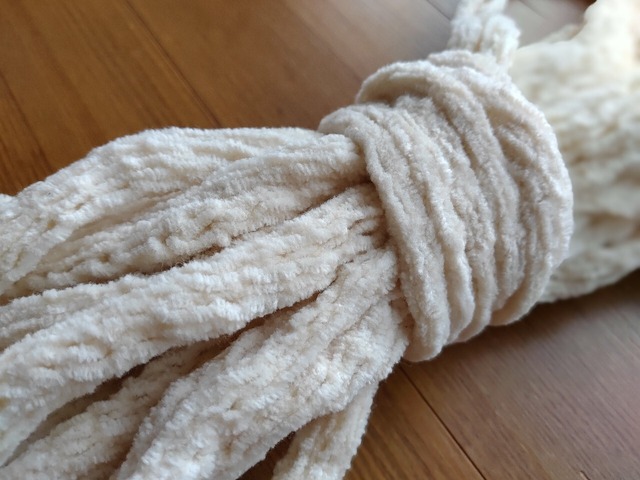 【商品名】ののやん ミミズ(縮絨ウールブークレ)100g巻 【特徴】 ウールブークレをメリヤス編みし、縮絨した極太糸です。 【詳細】 ・混率:ウール80%ナイロン20% ・重さ:約100g ・カラー:ホワイト ・縮絨:有 ・末端の印:なし 参考情報 ルームシューズ両足:約200g アームカバー両手:約80g ネックウォーマー:約100g いずれも棒針8mmで編んでいます ※製品は見本です。 糸のみの販売です。 ※こちらの商品は保管期間が長いため、虫喰いによる糸切れがある場合があります。品質にご理解いただける方のみご購入をお願いいたします。 ▲▲▲▲▲▲ ののやんとは ▲▲▲▲▲▲ https://yamamba.net/nonoyarn/ 工場で余った糸をリサイクルして作っています。 太い紐の様に見えますが、両端がくるんと丸まっているだけで、伸ばすと平たい生地です。 リリヤン糸と作り方は似ていますが、リリヤンは円筒状で、ののやんは半円。 「リ」の半分だから「ノ」。リリヤンじゃなくてノノヤン。 断面の形状も平仮名の「の」に似てるので「ののやん」です。 ▲▲▲▲▲▲▲ ののやんの特徴 ▲▲▲▲▲▲▲ ののやんは太くてすぐ編めるので、何度でもほどいて編み直しがしやすいのが特徴です。 【使用例】 ・今日は三つ編みストールに、今日は四角いスヌードに! 首回りのアイテムならお出かけ前の3分で編めちゃう、編まずに巻いておくだけでもイイ! その日の気分によって違う形を編んで、オシャレのアクセントに。 編み針なくても指や腕だけでも編めますよ。 ・ちょっと入れ物が欲しい?ちょっと座布団が欲しい?すぐ編んで進ぜよう! その場で必要なものをさっと作れる。 そしてすぐ編めるからほどくのに抵抗もない。 何にでも形を変える、魔法の糸。 ・編物が分からない? テキトーでいいんだ!くるくるこねこねやってたら何かになる、そんなんでも可愛いし楽しい! 子供の指遊びに最適です。遊び終わったらまた紐に戻して飾っておいてね。 編目が見やすいから編物の練習にも超おすすめです! ・なんならののやんもほどけます。 ののやんは一本の繋がった糸で出来ています。 ののやんになんか飽きたなーと思ったら、ののやんをほどいて元の糸に戻せます。 ほどいた糸でセーターなど別のものを編んで、一人リサイクル!?できますよ。 (縮絨している商品はほどきにくいのでご注意ください) めっちゃ簡単で、めっちゃ楽しくて、エコ!でしょ? ▲▲▲▲▲▲▲▲▲ ののやんの使い方 ▲▲▲▲▲▲▲▲▲ 【編み方】 太いので編み針を使わずに指や腕を使って編めます。 もちろん極太糸用の編み針を使ってもいいですよ、編み目が綺麗に整います。 家にある適当な棒でも、ひと工夫すればそれで編めます。 【つなぎ方】 ののやんは太いので結び目が目立ちます。 途中で色を変える時や糸が足りなくなった時などは結ばずに糸を足して編むのがベター。 一番綺麗なのはひと手間ですが、ののやん同士を縫い糸でザクザク縫い合わせるか、編物が出来るなら、少し糸をほどいてはぎ合せるのがベストです。 【糸始末】 編み終わった後の糸始末は、糸の末端を編地に適当に編み込んでおけばOK! 末端が出っぱなしも面白いと思います。 【ほどき方】 ののやんは片側末端に違う糸で印をしてあります。 印のない方から編んでいくと最後に印がきます。 編物をほどくときは編み終わりから、つまり印がついているところからほどいていけばいいのです!分かりやすーい! (印のしていない商品もあります) 【糸の切り方】 途中で切りたい時は、ハサミでジョキっと切ってOK! 編物が出来る人は両端の糸を切って引き抜いて伏目をしておくと綺麗です。